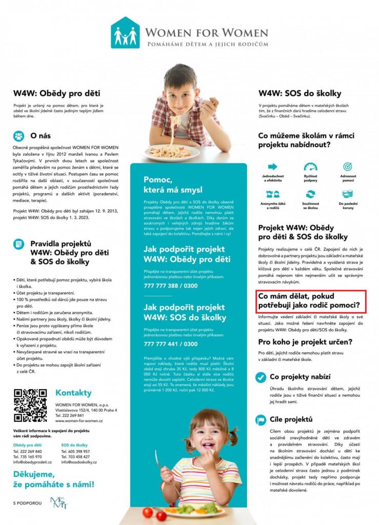 Naše škola je zapojena do celostátního projektu W4W: Obědy pro děti, který vznikl v roce 2013 pod záštitou obecně prospěšné společnosti WOMEN FOR WOMEN.