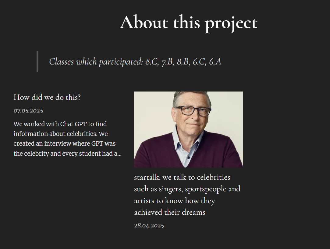 Ve dnech 28. a 29.4. 2025 proběhly na ZŠ Mozartova projektové dny. Pod tématem Cesta za snem se vytvořilo mnoho krásných projektů. Žáci, kteří se přihlásili do mé skupiny, tvořili rozhovory s celebritami pomocí umělé inteligence a vyzkoušeli si práci novináře v redakci pop-kulturního online časopisu/webu. Vytvořené rozhovory upravili do své úrovně angličtiny, navzájem proběhly korektury textů a články byly vsazeny na web. Ten byl vytvořen také v rámci projektu dvěma žáky: Dominik Brčka (7.B) a Roman Manina (8.C) prostřednictvím webového editoru Webnode. Kluci neměli zkušenosti s tímto editorem, ale během dvou dnů se naučili základy práce s články a stránkami a ke konci druhého dne už Webovky byly připraveny. Druhý krok byl vložit jednotlivé články. Funkci editorů byli spolu s „webaři“ kluci ze 6. třídy. Žáci a žákyně se během tohoto projektu naučili práci s textovým editorem Word, editaci webových stránek, základní pravidla typografie a jak to funguje v redakci. Vzhledem k šibeničním termínům, kdy k vytvoření článků měli pouhé dva dny, se realita hektického prostředí novinářské profese povedla navodit. Také jsme zjistili, že není zas tak jednoduché pracovat s AI, když je pokyn zadán nepřesně a na formulaci žádosti velmi záleží. Aktivity byly prostřídány s venkovními činnostmi a kooperačními hrami. Proběhla i závěrečná diskuze a společné zhodnocení kladů a záporů projektových dnů.