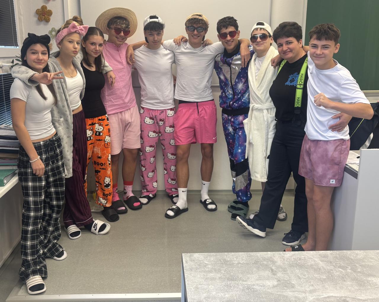 Část třídy 9.B se 28.11.2025 připojila k akci školního parlamentu CRAZY DAY s podtextem – přijď do školy v tom, v čem bys nikdy nepřišel.