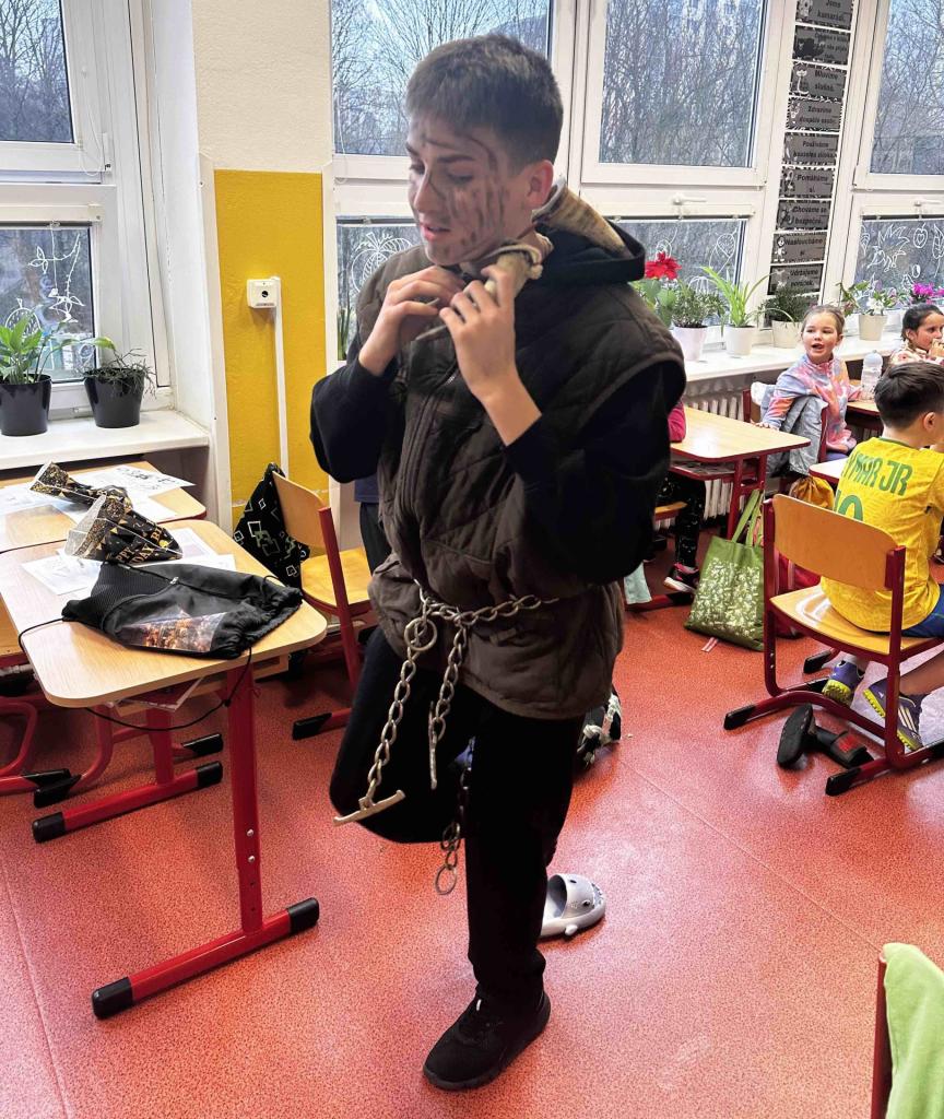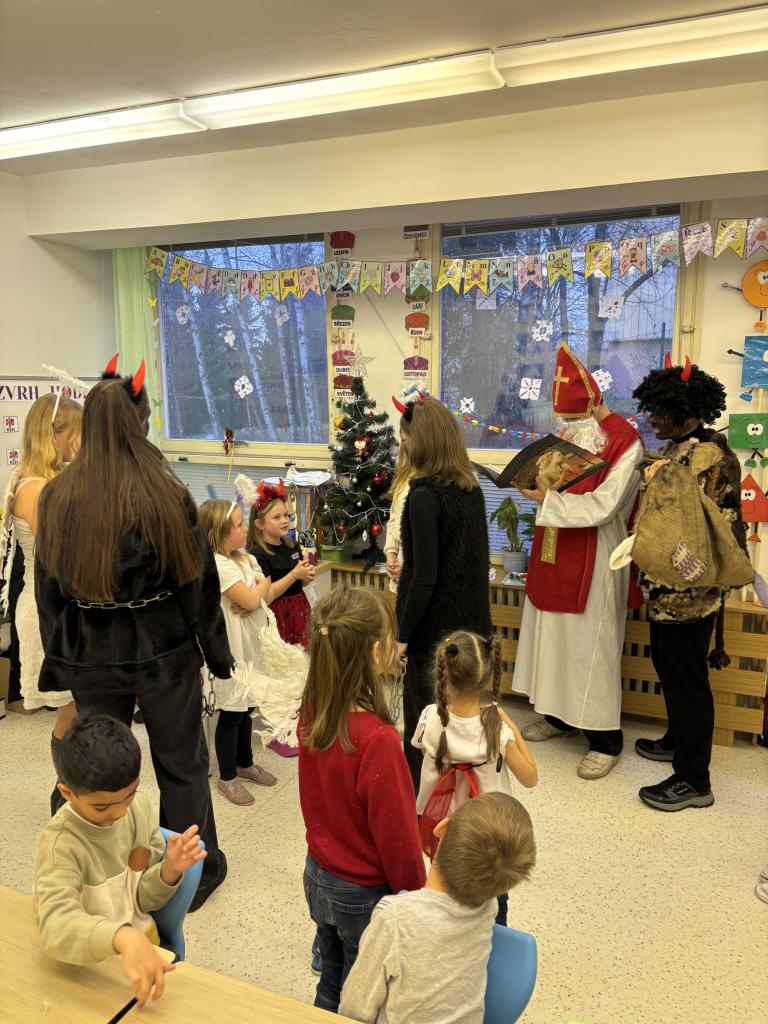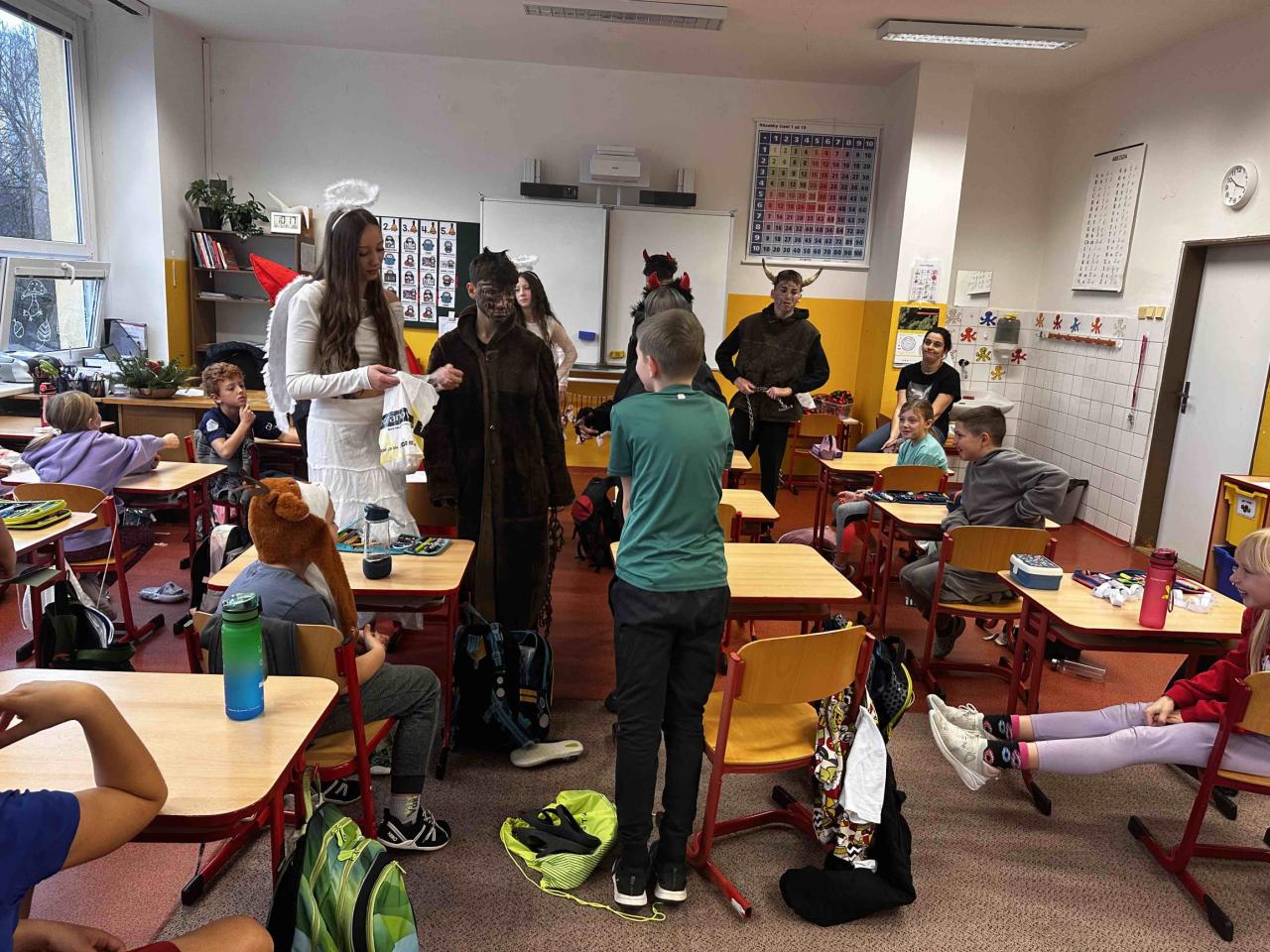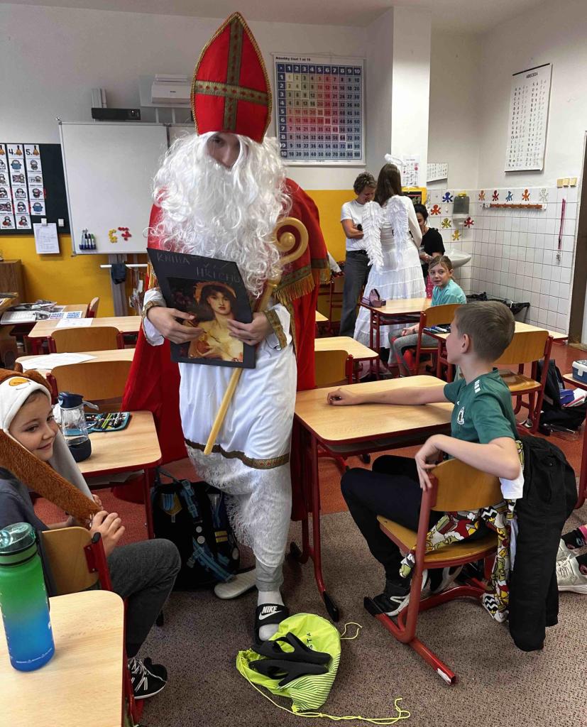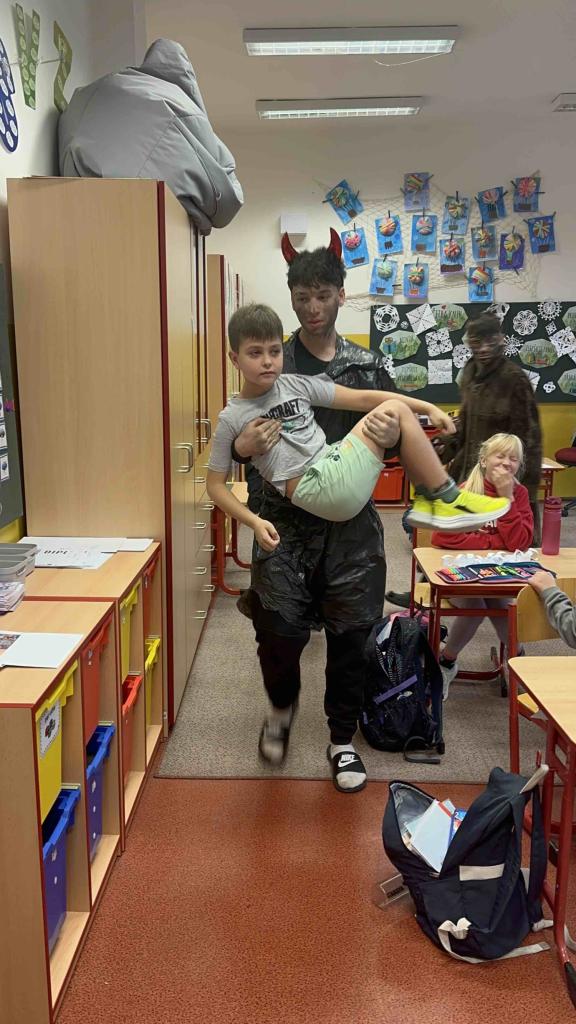Později zavítali také do přípravné třídy a postupně nakoukli do tříd 1. stupně, kde děti přivítaly Mikuláše s velkým nadšením. A protože odvaha deváťákům nechyběla, jejich kroky občas vedly i na 2. stupeň, kde sklidili neméně přátelské přijetí.
