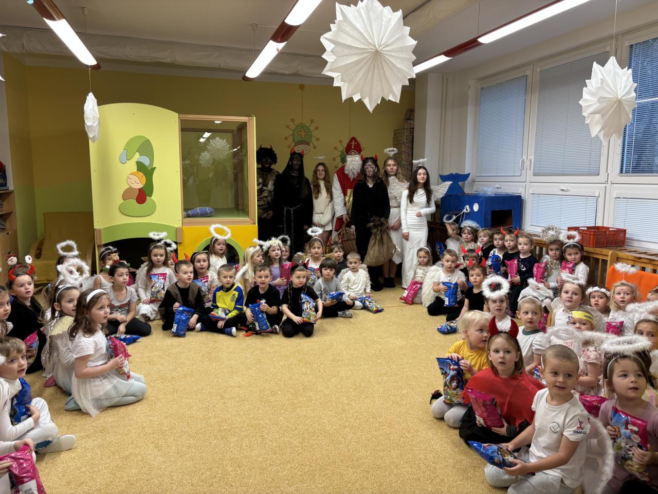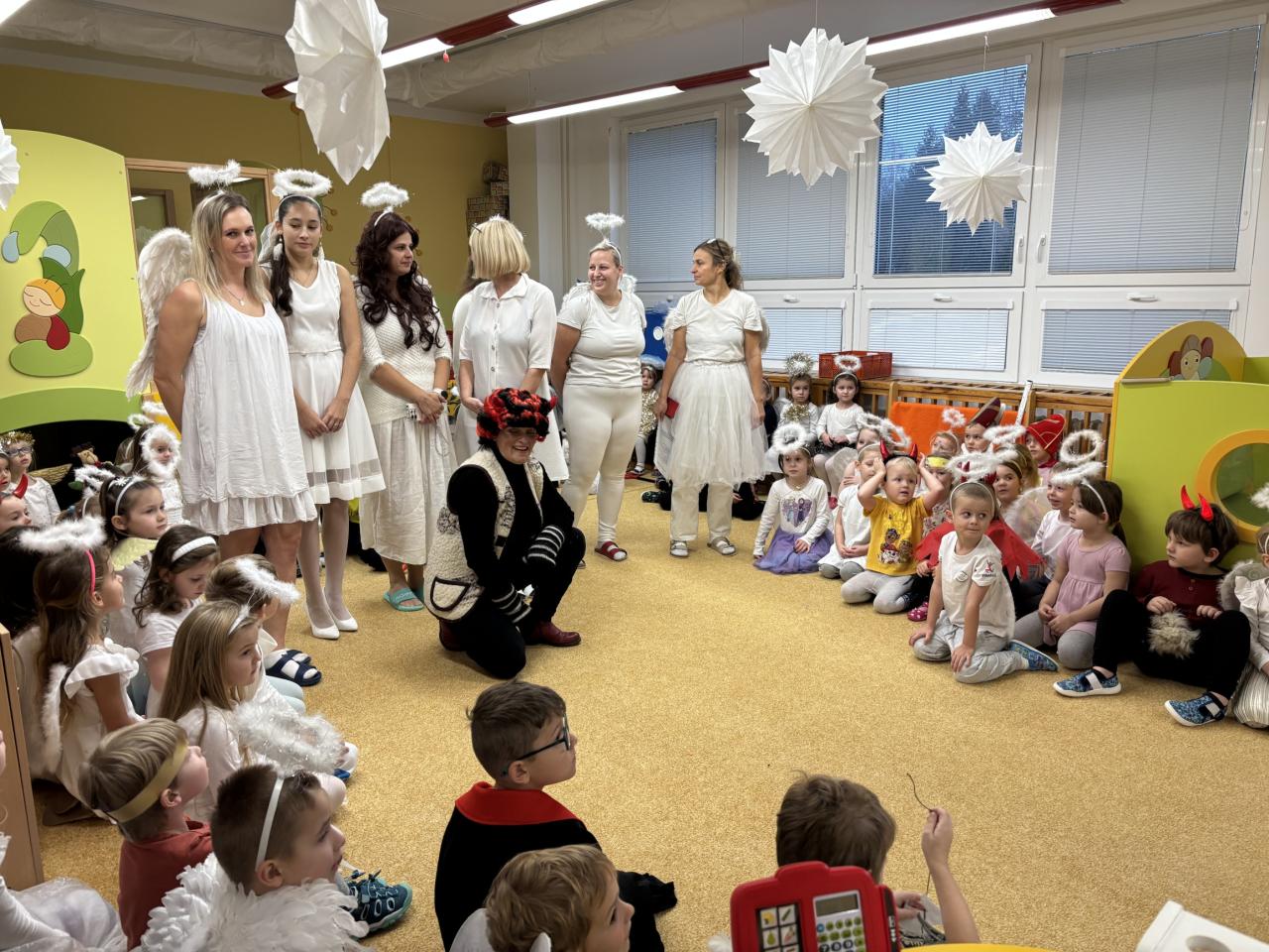 Deváťáci nejprve zamířili do MŠ Muchomůrka a MŠ Mšeňáček, kde je čekaly nadšené a nedočkavé děti. Mikuláš se svou družinou rozdával drobná překvapení a především dobrou náladu. Čerti se postarali o správnou dávku napětí a andělé zase přinesli klid a úsměvy.