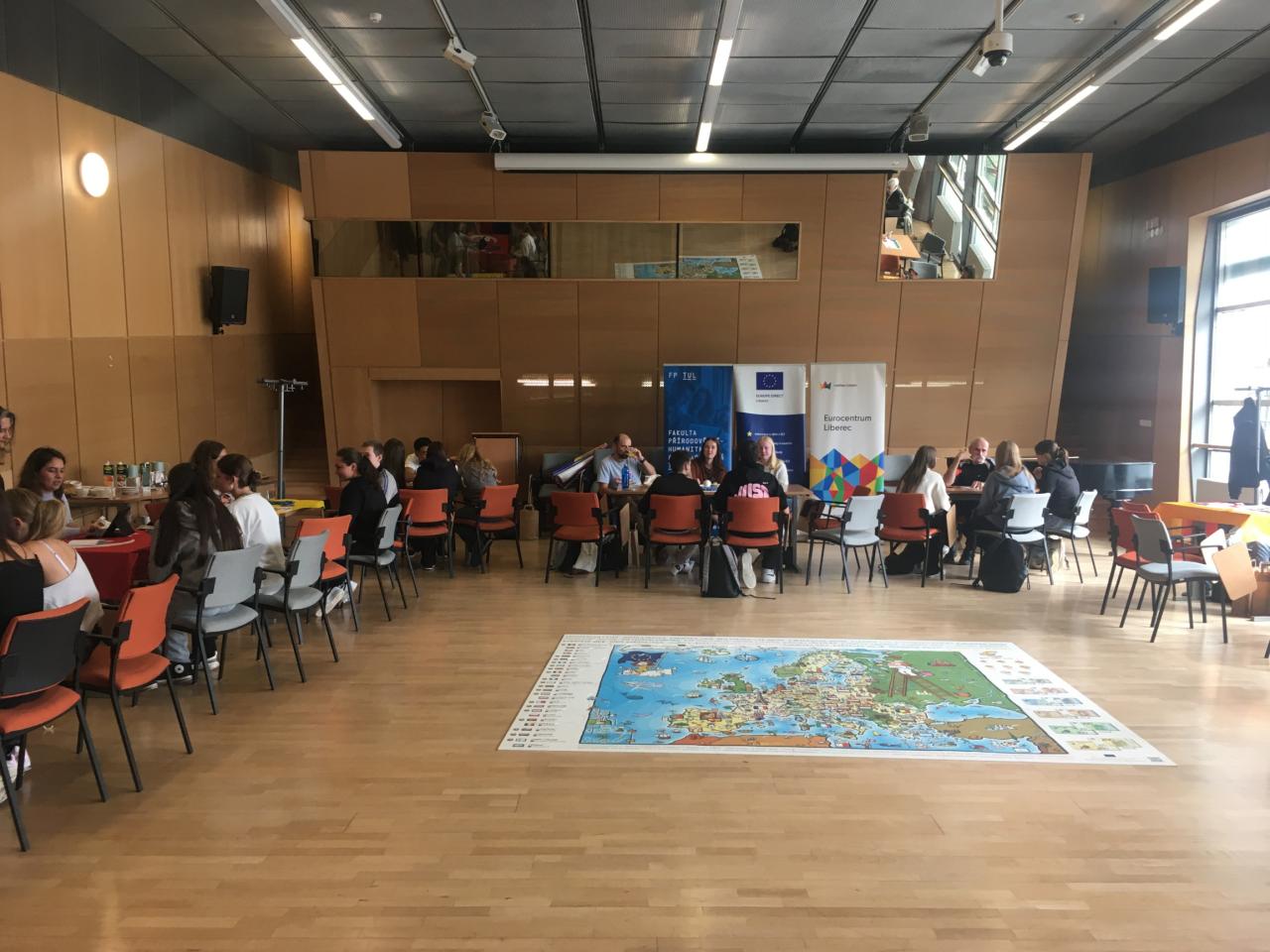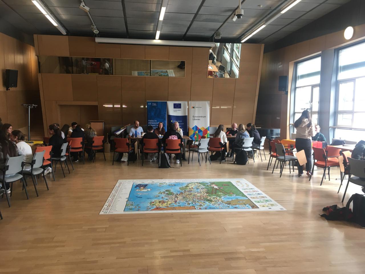 Na závěr čekalo žáky krátké, ale intenzivní setkání s rodilými mluvčími. Měli možnost vyzkoušet si konverzaci v různých jazycích, prohlédnout si obří puzzle Evropy a obdivovat výtvarná díla z evropské soutěže.