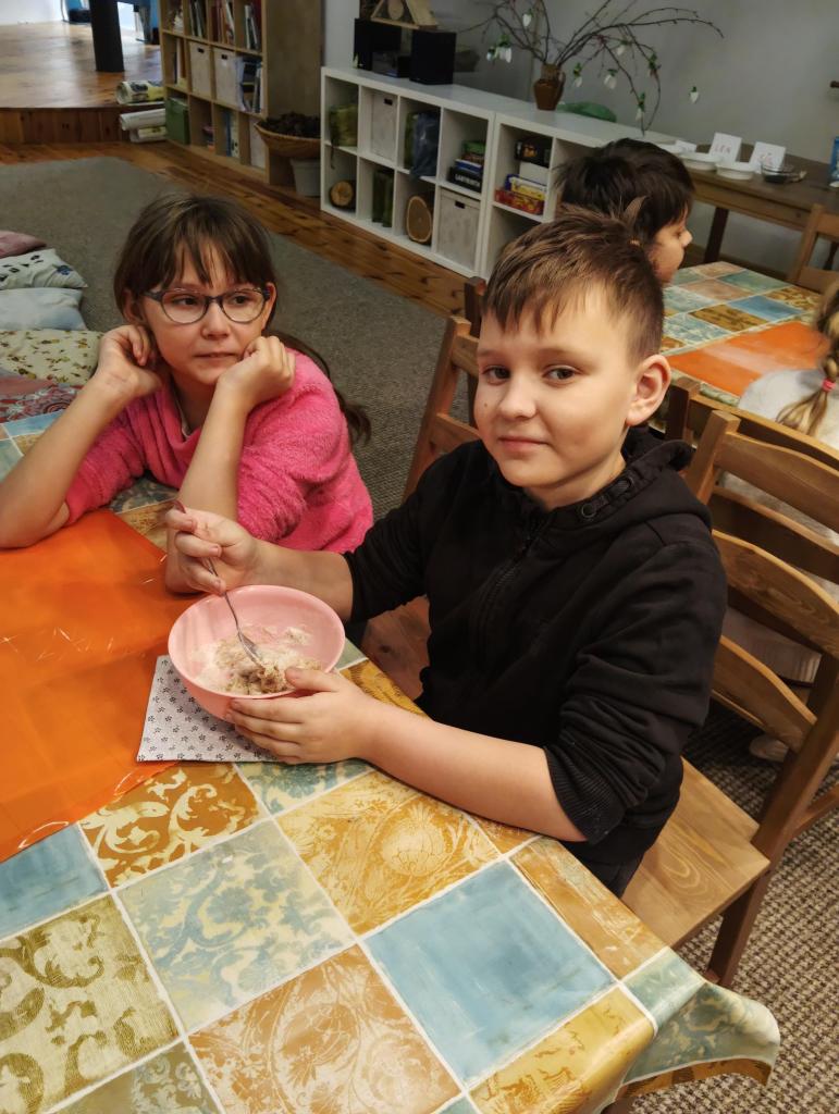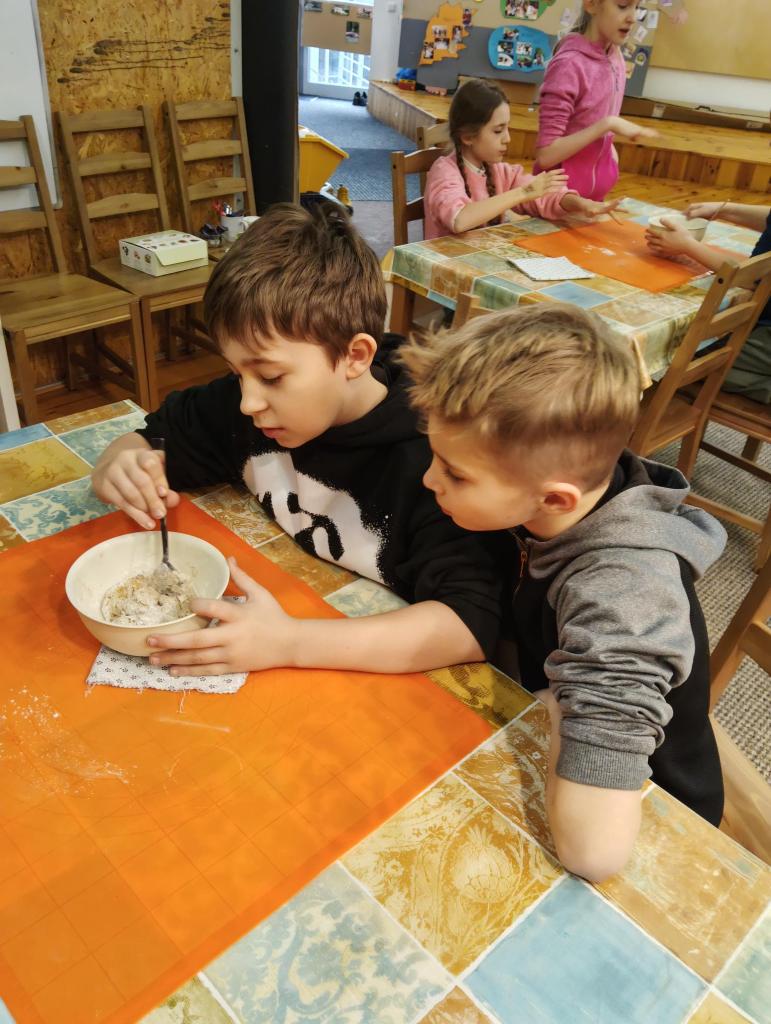 Další část projektu už krásně voněla. Pustili jsme se do samotné přípravy těsta. Nejprve jsme si vysvětlili, co je kvásek a jak fungují kvasnice. Společně jsme je „oživili“ a s napětím sledovali, jak začínají pracovat.