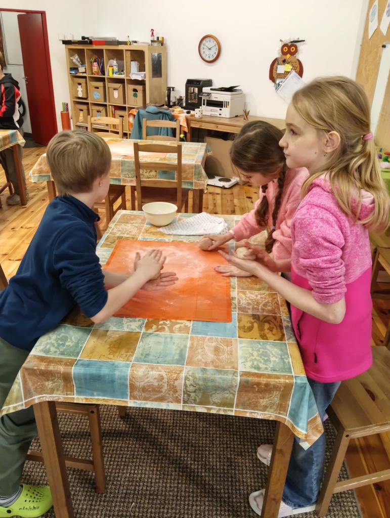 Ve správném poměru jsme smíchali mouku celozrnnou, žitnou a hladkou, přidali chlebové koření, olivový olej, sůl a kmín. Děti si vyzkoušely práci s těstem – hnětení, spojování surovin i trpělivé čekání, než těsto vykyne. I zde jsme si kladli otázky: