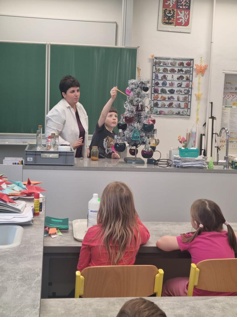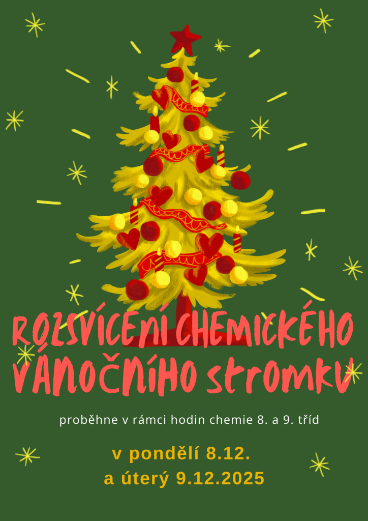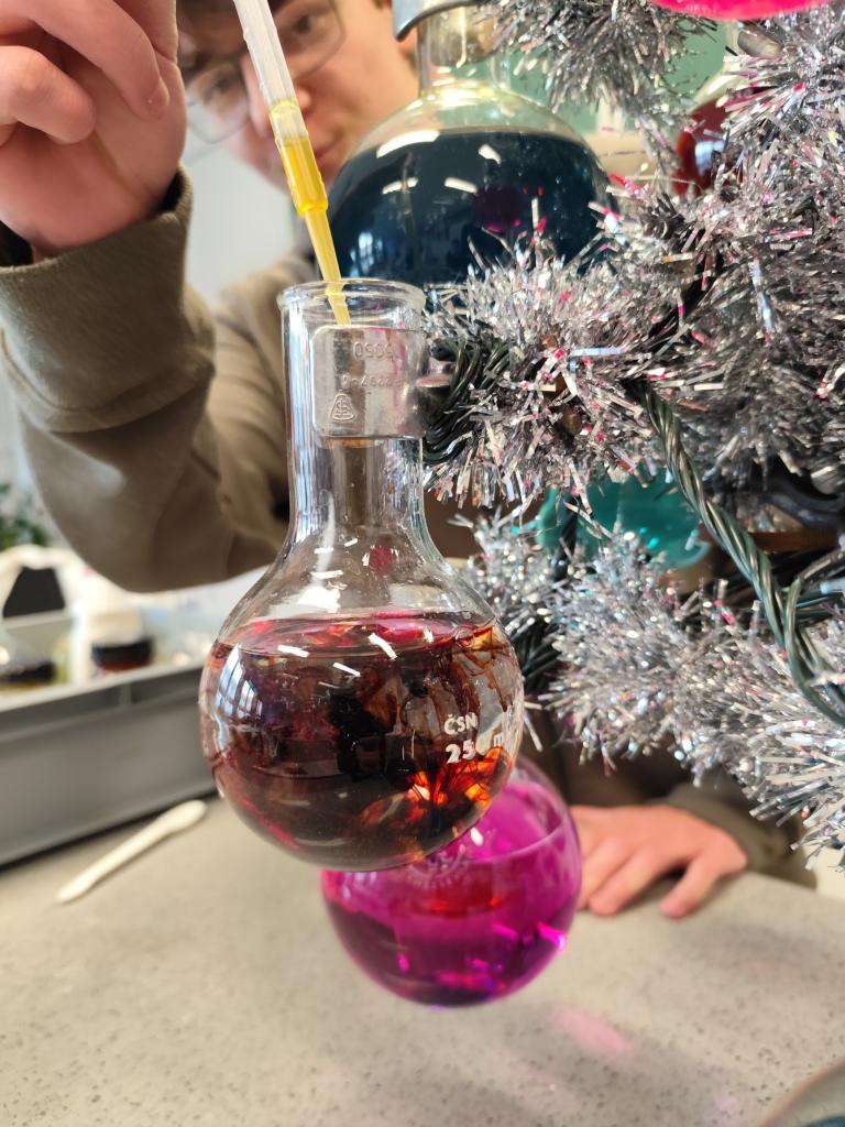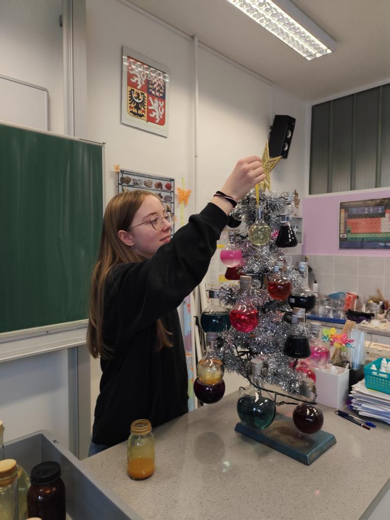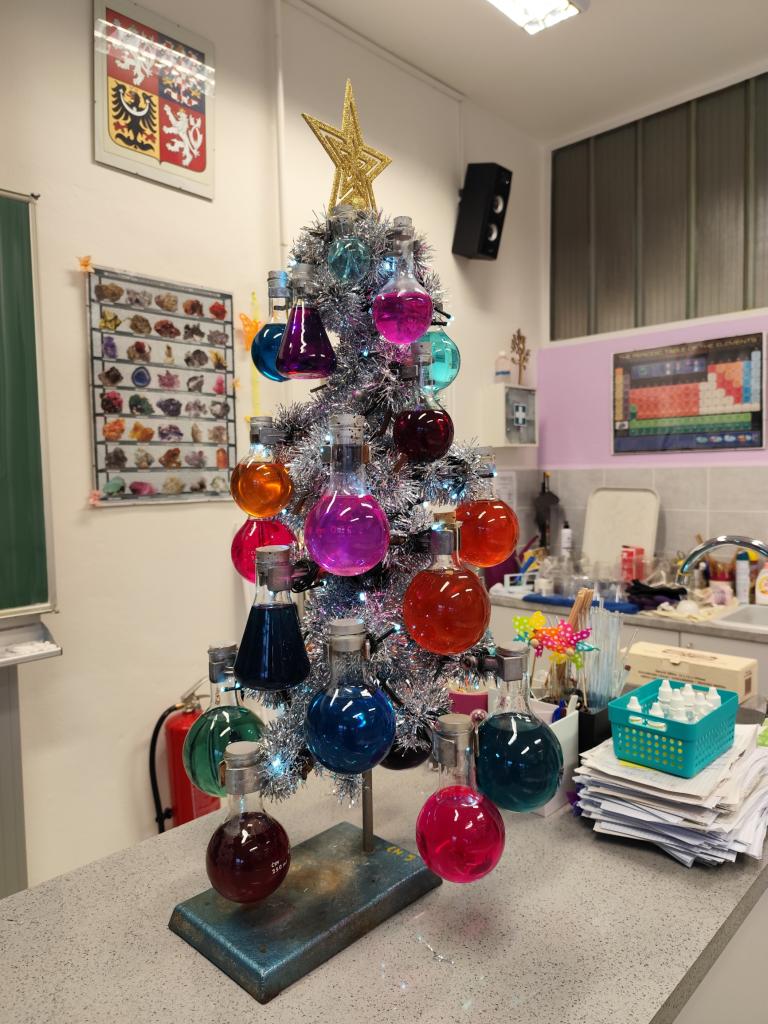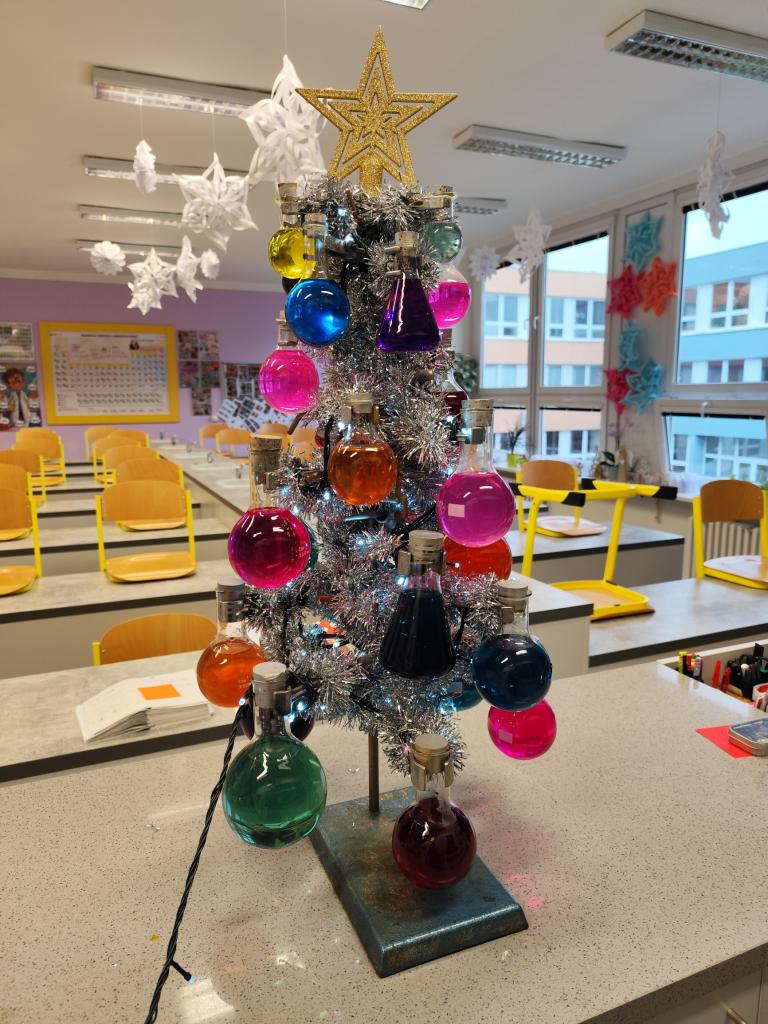 Již tradičně v tomto předvánočním čase čekalo osmáky a deváťáky zpestření hodin chemie v podobě rozsvěcení chemického vánočního stromku. Vybraní žáci „barevně rozsvěcovali“ baňky provedením chemické reakce většinou dvou chemických látek. Navštívili nás i zájemci z 1. stupně, kteří moc rádi využili možnosti učebnu mírně zadýmit rozkladem peroxidu vodíku.