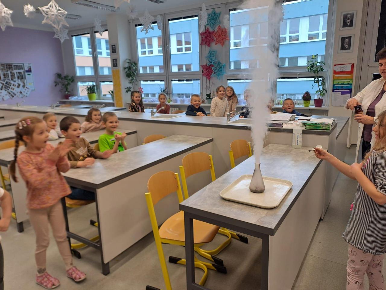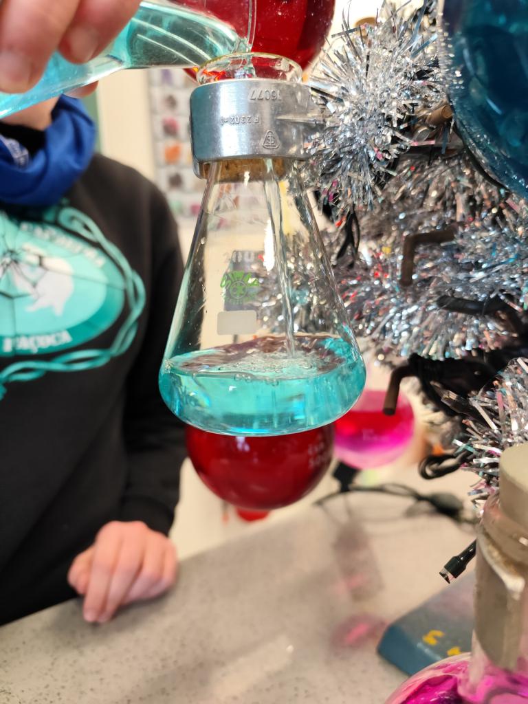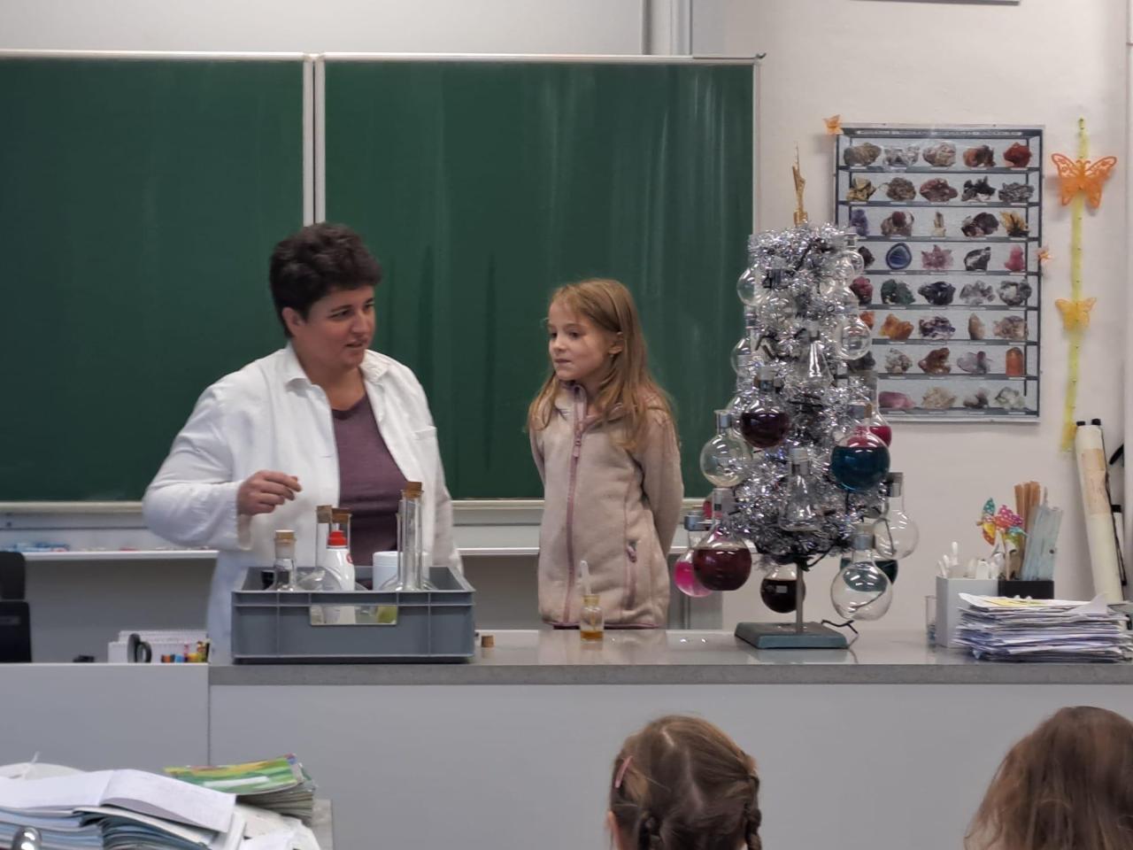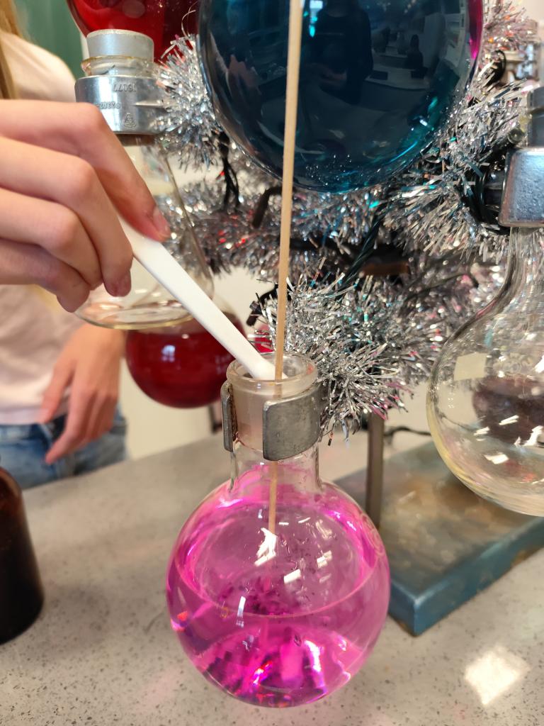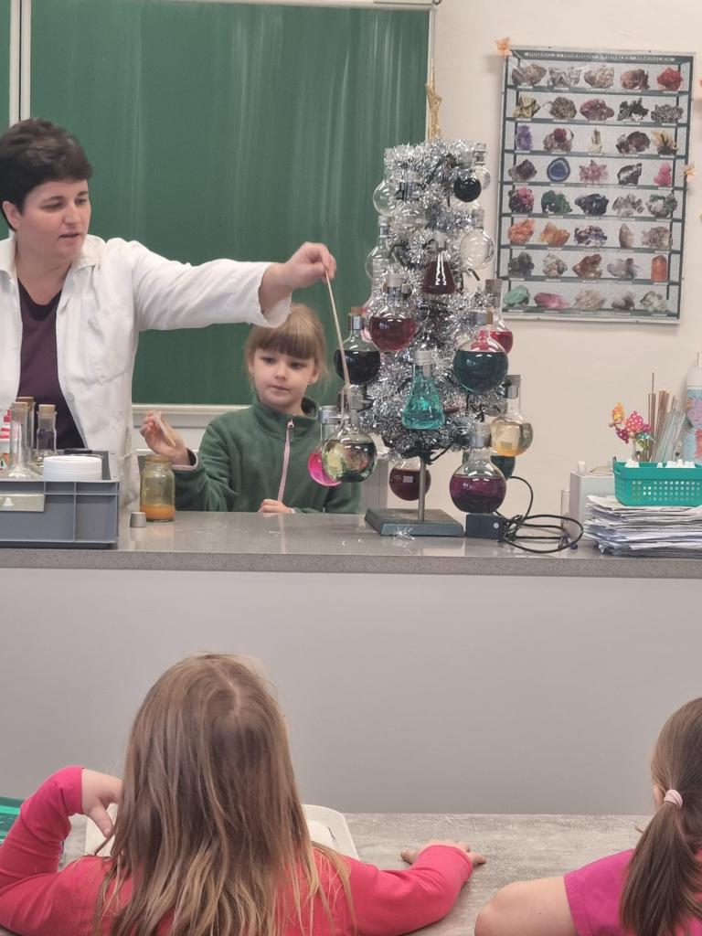 Již tradičně v tomto předvánočním čase čekalo osmáky a deváťáky zpestření hodin chemie v podobě rozsvěcení chemického vánočního stromku. Vybraní žáci „barevně rozsvěcovali“ baňky provedením chemické reakce většinou dvou chemických látek. Navštívili nás i zájemci z 1. stupně, kteří moc rádi využili možnosti učebnu mírně zadýmit rozkladem peroxidu vodíku.